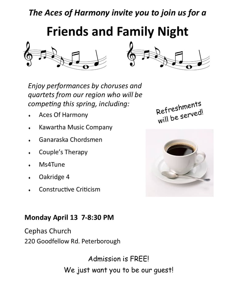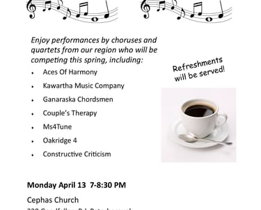 That's why we are inviting you to be our guests Monday April 13 as our regional choruses and quartets strut their stuff!